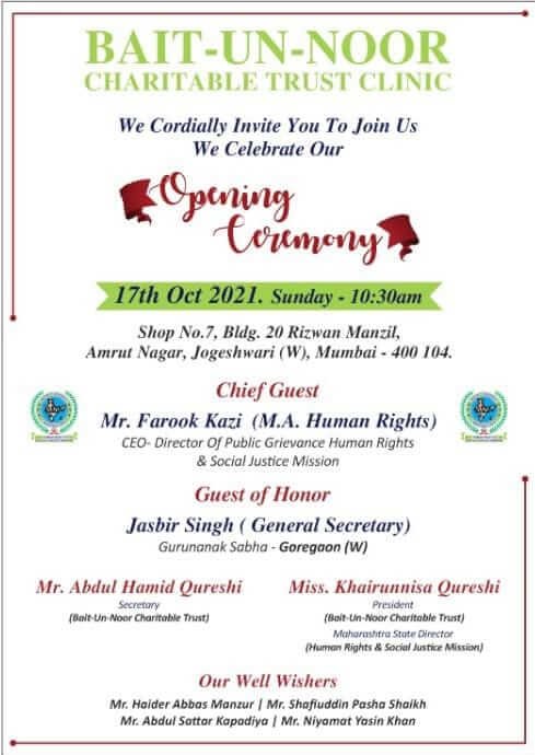 Human Rights & Social Justice Mission’s Maharashtra State Director Ms. Khairrunisa Mohammed Ali Qureshi Initiated an Charitable Trust Clinic with the name “Bait-Un-Noor” The Charitable Clinic was Inaugurated by C.E.O of Human Rights & Social Justice Mission on 17th Of October 2021.